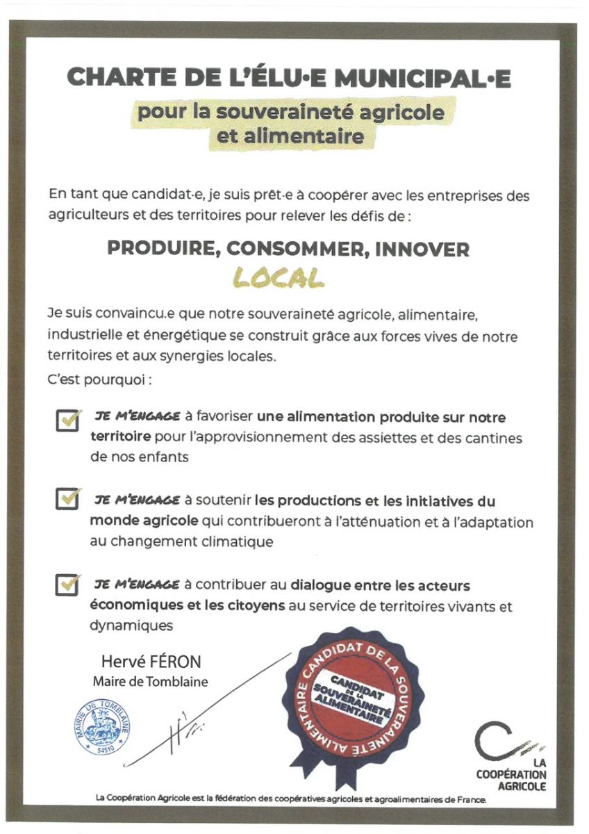 Ces coopératives agricoles invitent donc les candidats et futurs maires à signer cette charte de l’élu-e municipal-e