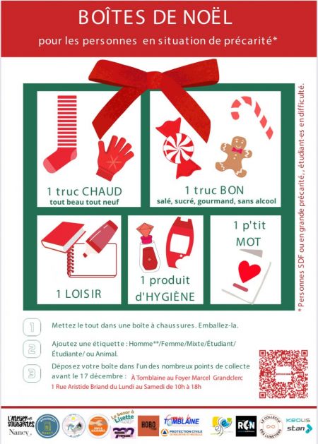 A Tomblaine, vous pouvez déposer votre ou vos boîte(s) de Noël au Foyer Résidence Marcel Grandclerc – 1, rue Aristide Briand – du lundi au samedi de 10h à 18h.