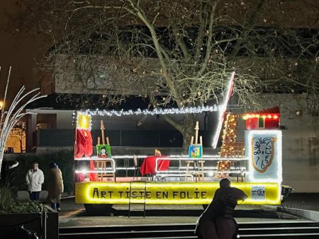 Et puis, il ya eu la présentation du char de la ville de Tomblaine qui participera samedi 6 décembre au grand défilé à Nancy jusqu’à la Place Stanislas. Comme le thème cette année sera « Les années folles », notre char s’intitule « Art’istes en folie », la rencontre de Frida Kahlo, Pablo Picasso et Salvador Dali … Il est vraiment magnifique, tout en couleurs et en lumières, un décor de cabaret, avec des tableaux des trois peintres, reproductions réalisées par les enfants de Tomblaine, on voit même sur ce char la Tour Eiffel, qui porte les ailes du Moulin Rouge ! Une première !