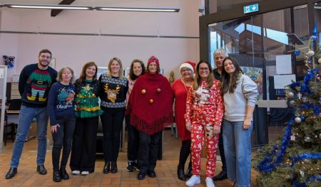 On y travaille avec le plus grand sérieux jusqu’à la dernière minute pour rendre service aux usagers, mais la tradition à Tomblaine, c’est aussi que, chaque année, les personnels qui travaillent en mairie le 24 décembre au matin, quand d’autres sont en vacances, viennent habillé(e)s sur le thème de Noël : magnifiques pulls de Noël, pyjama collector, habit de mère Noël, bonnet …
