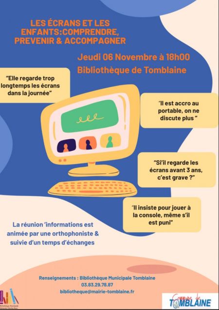 Initiative très intéressante du service bibliothèque de la commune, cette réunion d’information animée par une orthophoniste est accessible à tous. Jeudi 6 novembre à 18h.