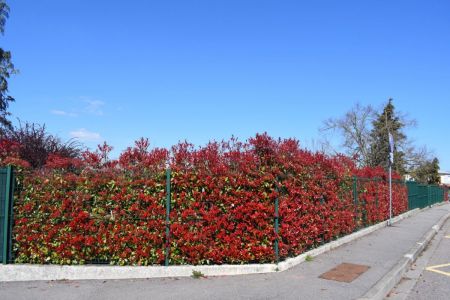 A l’automne dernier, sur demande des enseignants, il a été souhaité de faire un écran visuel pour occulter la cour de récréation de l’école maternelle Pierre Brossolette, qui donne sur la rue Mozart et sur la Place Paul Bert … Le service environnement de la Commune avait planté ces arbres : des photinias … Ils se sont développés rapidement et donne aujourd’hui cet aspect rouge et lumineux … Magnifique !