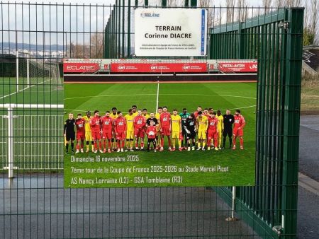Après le beau parcours du club local le GSA Tomblaine, en Coupe de France, un superbe panneau collector a été installé par les services municipaux sur la clôture du terrain que Corinne Diacre avait inauguré en personne à l’époque. Il vient s’ajouter aux autres panneaux-souvenirs, parmi lesquels ceux qui évoquent la carrière d’un des « parrains » du club, le tomblainois d’origine, à la brillante carrière, Maxime Chanot !