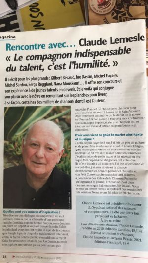Actuellement beaucoup de médias s’intéressent à l’actualité de Claude Lemesle, il vient d’avoir 80 ans et, à cette occasion, il y a 10 jours, il a donné dans une grande salle à Paris un « marathon-concert » d’une journée, pendant lequel il a chanté un grand nombre de ses compositions, devant un public nombreux et conquis !